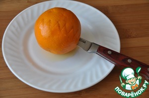 Берём апельсин тщательно моем. Можно просто разрезать пополам, а можно острым ножом разрезать пополам "уголками".