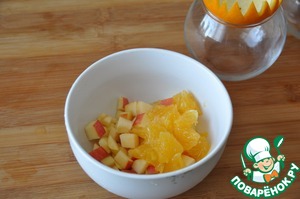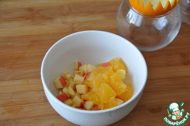 Апельсин филеруем. У яблока удаляем сердцевину и режем мелкими кубиками.