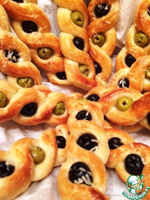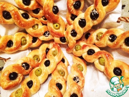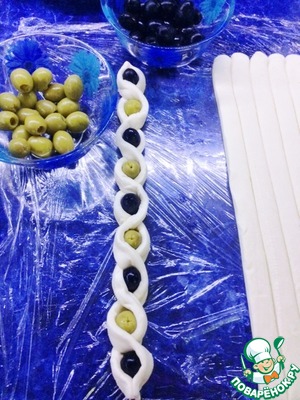 Я чередовала черные и зеленые оливки (это не обязательно). Длину косички определяем по желанию. Я делала на 9 маслин, но потом разрезала готовые пополам. Так что оптимально-удобная длина на 5 маслин.