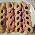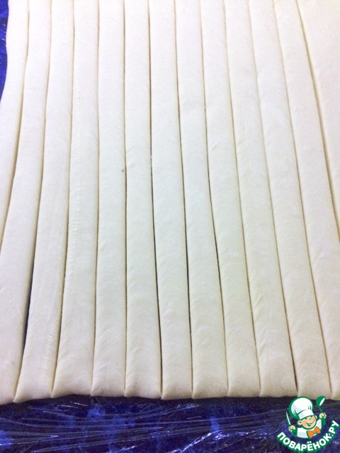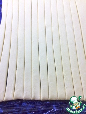 Тесто размораживаем и нарезаем на полоски шириной примерно 1 см.