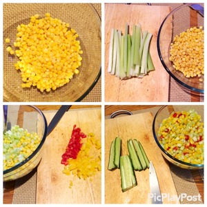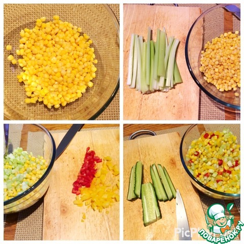 Моем овощи. Откидываем кукурузу на дуршлаг. Нарезаем кубиком сельдерей, красный и желтый перец, огурец свежий.
