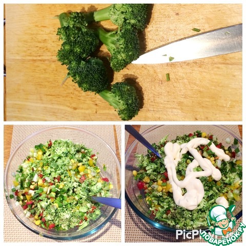Также нарезаем брокколи и все отправляем в салатник. Перемешиваем, солим и перчим по вкусу. Добавляем майонез.
