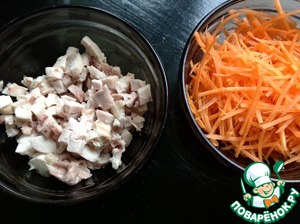 Курицу нарезать маленьким кубиком. Морковь натереть на терке для корейской моркови (или очень тонко нашинковать соломкой).