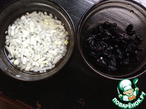 Изюм залить кипятком и оставить на 10 минут. Затем слить воду, изюм подсушить на бумажном полотенце. Лук нарезать как можно мельче и замариновать на 10 минут. Для маринада: в воду добавить сахар и уксус, перемешать и выложить лук. По истечении времени лук отбросить на дуршлаг и дать стечь лишней жидкости.