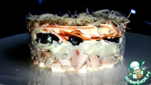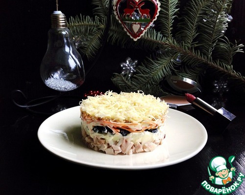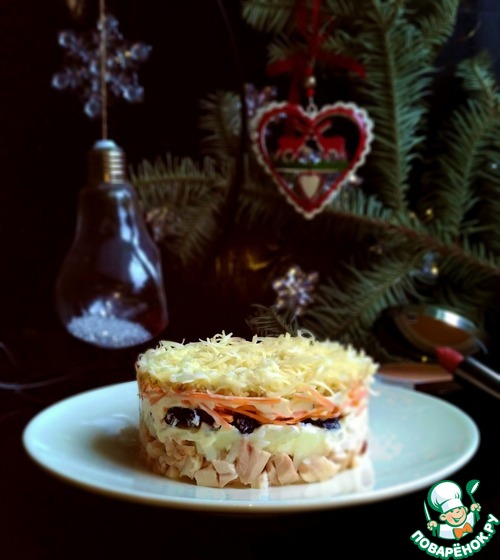 Это необычайно нежный, красивый и утонченный салат. С изысканными нотками куриного филе и сыра, с ярким послевкусием изюма и маринованного лука. С новогодними пожеланиями салат отправляется к Маше (masha vet). Угощайтесь!