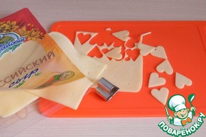 При помощи формочек для печенья вырезать из готовых ломтиков сыра ТМ "Белебеевский" "Российский" сердечки.