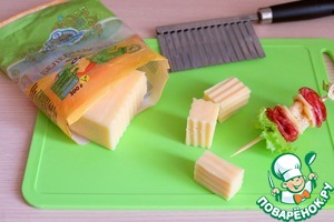 Сыр ТМ "Белебеевский" нарезать фигурным ножом на кубики, они послужат нам подставкой для будущих канапе. Ломтики сырокопченой колбасы нанизать на шпажки, чередуя сердечками из сыра и обжаренной чесночной гренкой. Завершающим аккордом оформления канапе послужит лист салата.