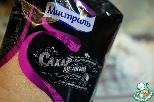 В просеянную муку добавить сахар. Я использую коричневый мелкий сахар ТМ Мистраль, он обладает карамельным вкусом и прекрасно подходит для выпечки и десертов.