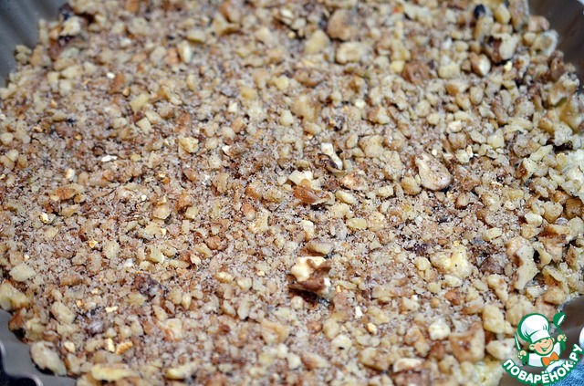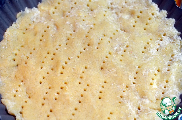 Смазать противень сливочным маслом. Выложить тесто и наколоть вилкой. По своему опыту хочу посоветовать делать этот пирог без формы - просто выложите тесто на противень и придайте ему форму прямоугольника или квадрата. Я делала в форме, и было очень неудобно резать и вынимать его из формы.
