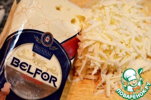 Сыр натереть на крупной тёрке. Для этого блюда я взяла сыр Бельфор Белебеевского Молочного Комбината. Он обладает сладковато-ореховым вкусом, сделан из натурального молока без добавления растительных жиров.