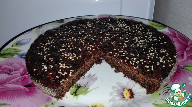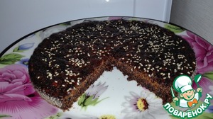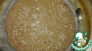 Готовое тесто перелить в смазанную маслом (диаметр 20-22 см) и присыпанную манкой или мукой форму. Я сверху посыпала кунжутом.