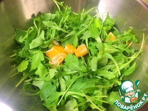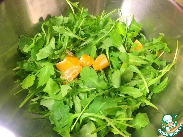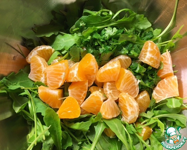 Возьмите салат. очистите мандарины, разрежьте дольки пополам.