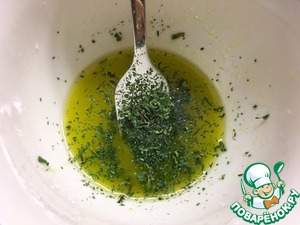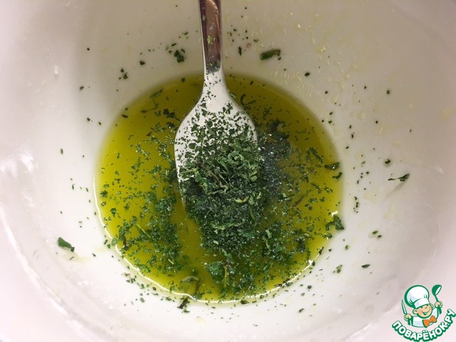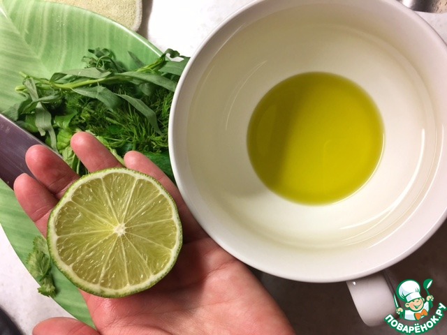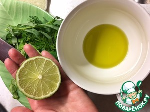 Приготовьте соус к салату. Так как мандарины сладкие, нужно сбалансировать вкус. Возьмите масло, выдавите сок лайма и добавьте сушеную мяту. Слегка посолите.