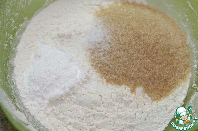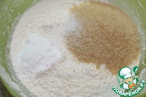 Смешать просеянную с разрыхлителем муку с сахаром.