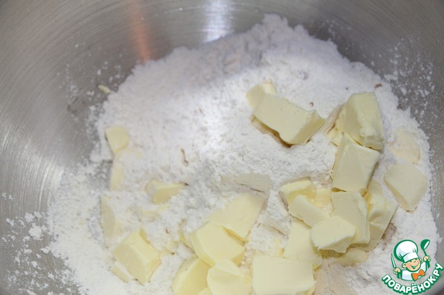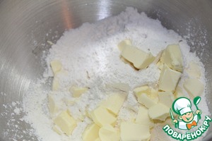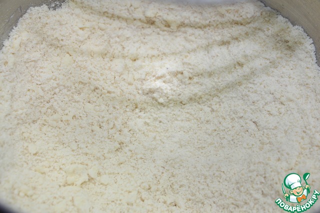 Перемешать масло с мучной смесью в мелкую крошку при помощи миксера, или порубить ножом.