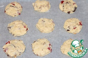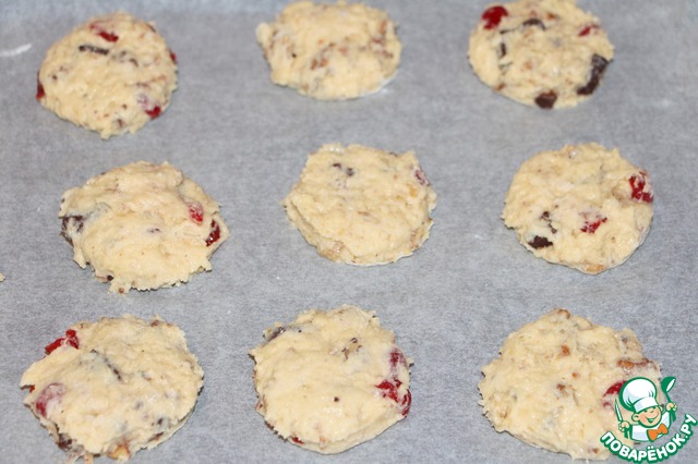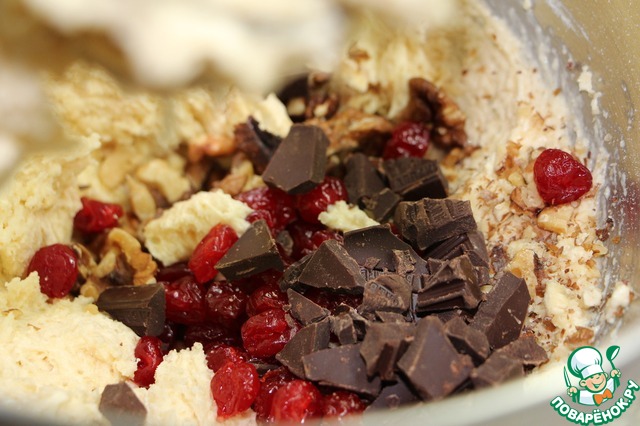 Добавить вяленые ягоды, орехи (порубленые крупно) и шоколад кусочками. перемешать.