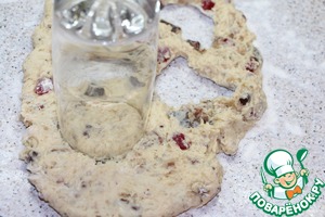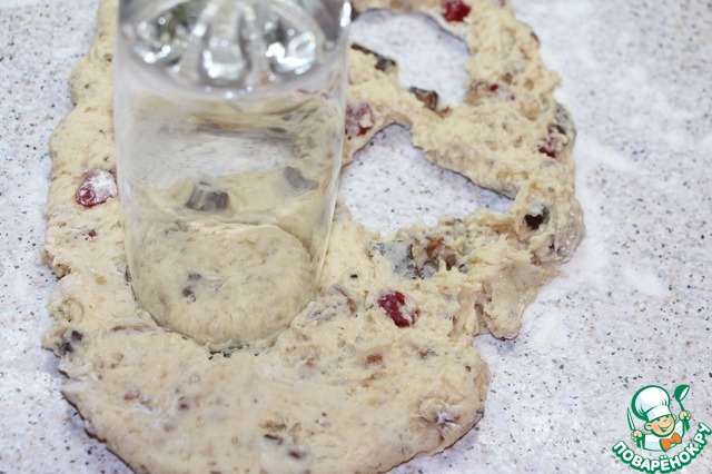 Убрать тесто в холодильник минимум на полчаса. На припыленной мукой рабочей поверхности раскатать тесто (не тонко, см 2, не тоньше), стаканом вырезать кружки.