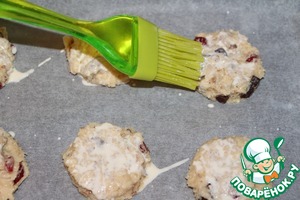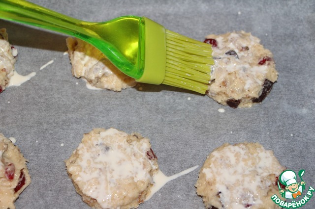 Смешать холодное молоко, холодные сливки и слегка взбитое яйцо, ( 1 ст. л. смеси отлить для смазывания печенек) добавить к масляно-мучной крошке, перемешать.