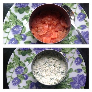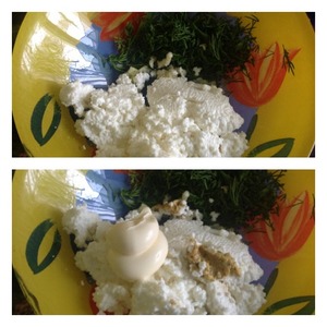 • Укроп мелко нашинковать, добавить сыр и зубчик чеснока пропущенного через пресс. Добавить майонез и горчицу. Ложкой тщательно перемешать сырную массу до однородного состояния.