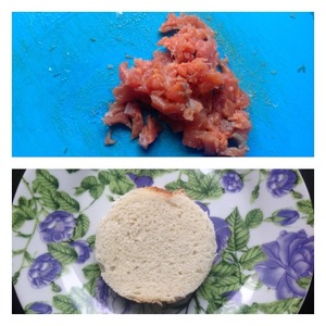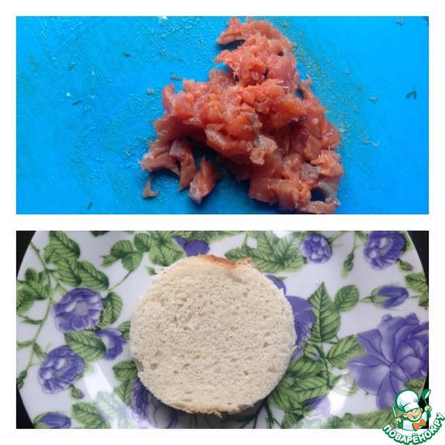 • Красную рыбку нарезать на маленькие кубики. Сервировочным кольцом из каждого кусочка хлеба вырезать круг. Смазать подготовленные хлебные кружочки сливочным маслом.