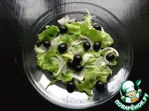 В тарелку для подачи салата нарвать листья салата руками. Сверху выложить маслины и лук, нарезанный тонкими полукольцами.