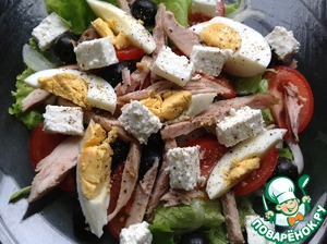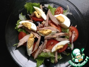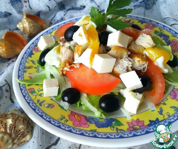 Половину помидора нарезать тонкими пластинками. Яйцо разрезать на 6 долек. Куриную голень нарезать тонкой соломкой. Все аккуратно выкладываем на салат.