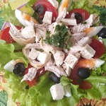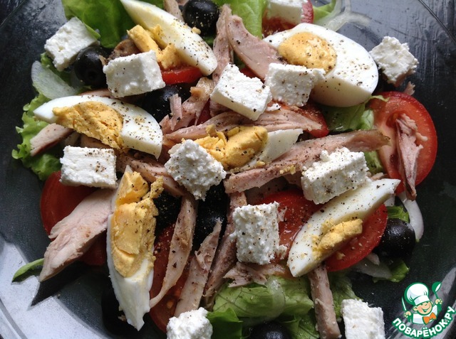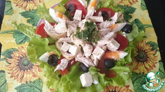 Сверху выложить нарезанный небольшими кубиками сыр. Посолить и приправить смесью перцев салат. Сбрызнуть лимонным соком и растительным маслом.
