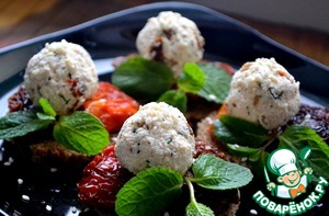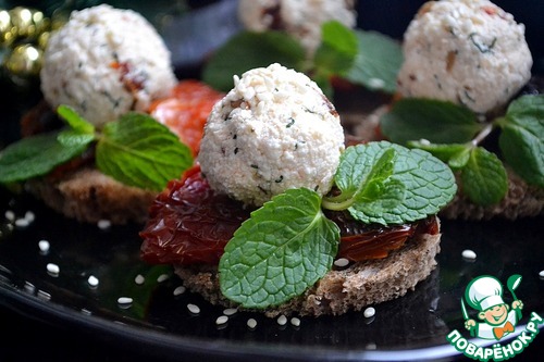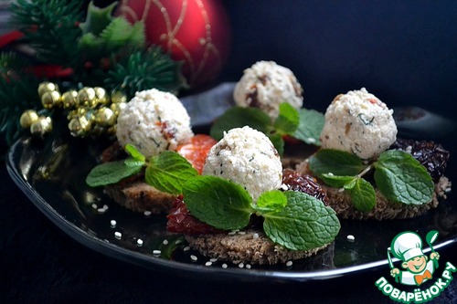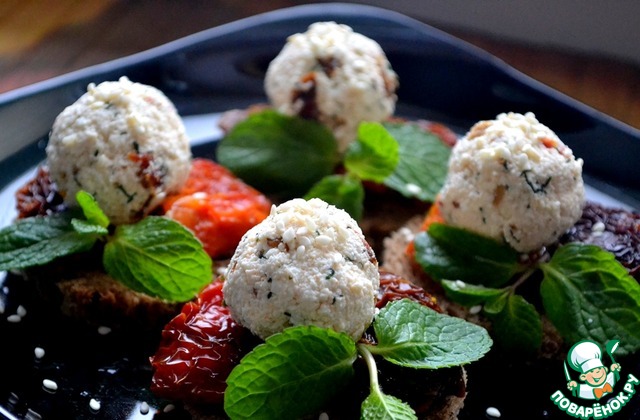 Кладем сырные шарики, украшаем зеленью, посыпаем кунжутом и подаем. Закуску можно сделать заранее, она прекрасно стоит в холодильнике.