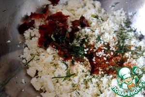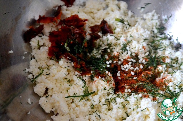 Измельчим сыр, добавим в него 2 ст. л. оливкового масла, кунжут, мелко нарезанный укроп и паприку