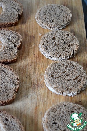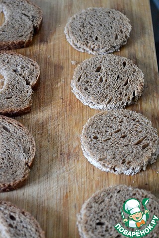 Из ломтиков ржаного хлеба стаканом вырезаем основу для тарталеток и обжариваем на сухой раскаленной сковороде с 2 сторон