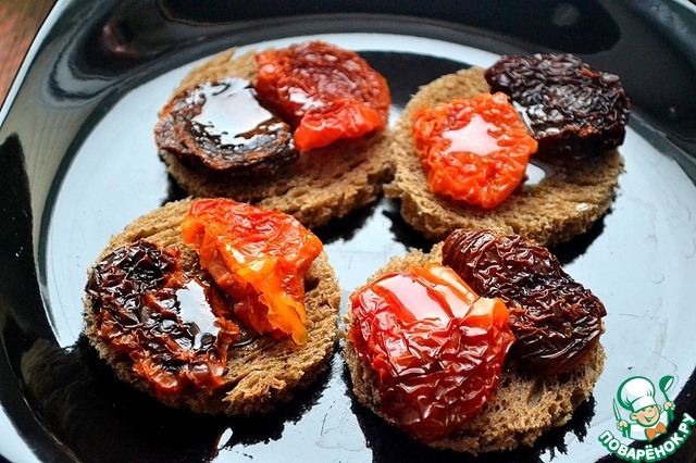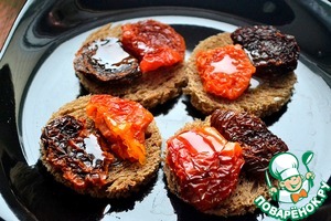 На каждый ломтик кладем по 2 вяленых томата, сверху поливаем оливковым маслом, буквально несколько капель