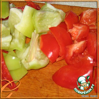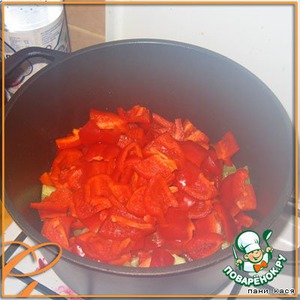В казанке разогреть масло, кинуть туда перчик и обжаривать на среднем огне до полу готовности