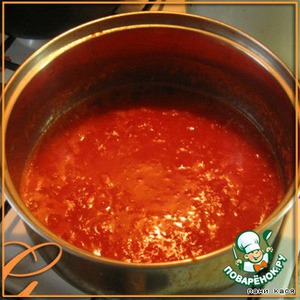 Ставим томатную массу на огонь, приправляем до вкуса солью, перцем, сахаром, доводим до кипения