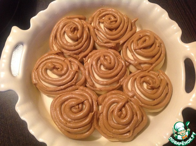 У пакета отрезаем уголок и выдавливаем тесто сверху на булочки круговыми движениями. -