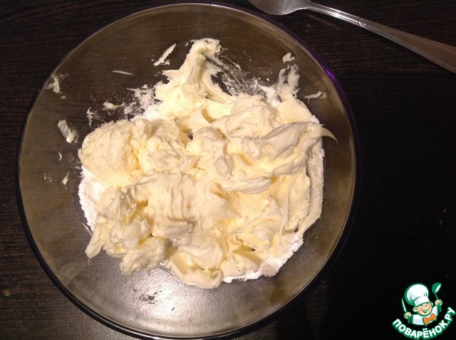 • Для крема маскарпоне перемешать с сахарной пудрой до однородной массы. Крем мне показался слишком жирным, сладким и скучным.