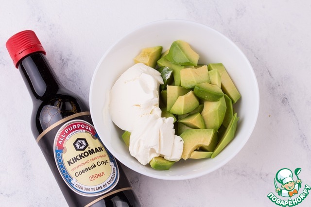 Добавить соевый соус, творожный сыр и взбить блендером в однородную массу. -