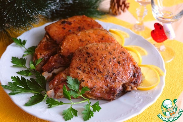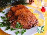 Готовые стейки выложить на блюдо, украсить дольками лимона и свежей зеленью петрушки.