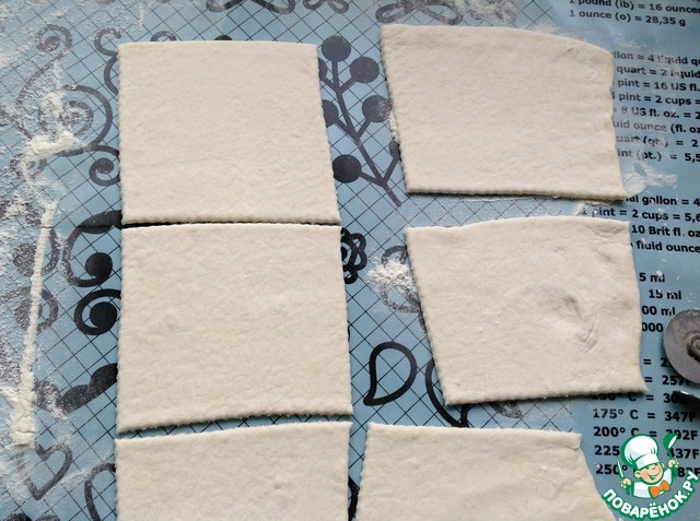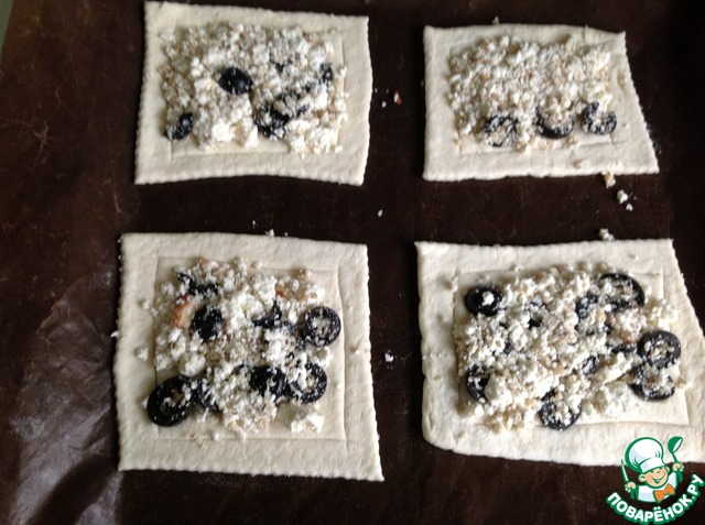 Выложить сырную начинку на квадрат не заходя за борта. Выложить слойки на противень застеленный пекарской бумагой или силиконовым ковриком. Отправить слойки в духовку минут на 10-15.
