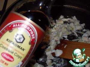 Влить соевый соус, перемешать и жарить ещё 1 минуту.