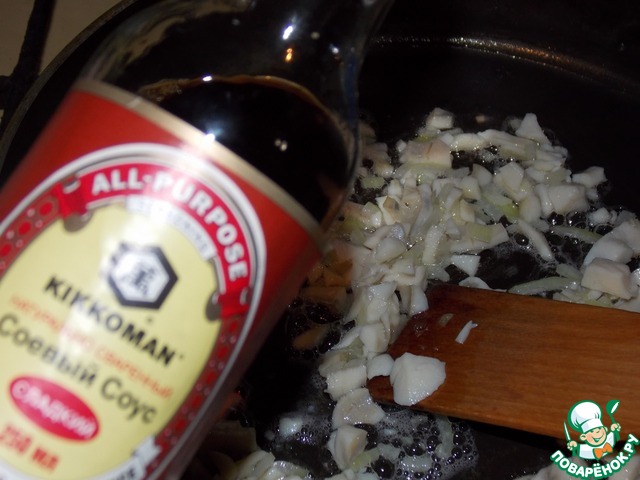 Так выглядит обжаренный лук с кальмаром и соевым соусом.