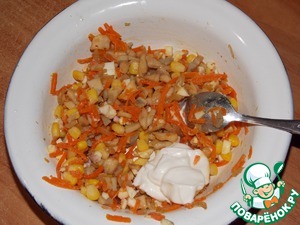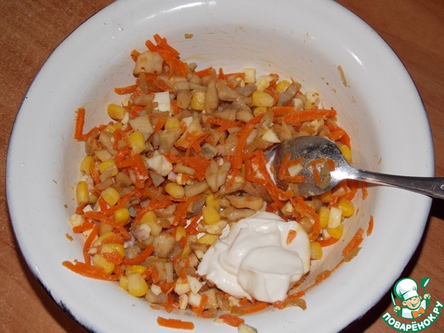 Смешать- кальмар, морковь, яйца, кукурузу.