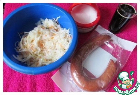 Вот они наши составляющие. Пиво может быть как светлым, так и темным, но со светлым пивом мне показалось вкуснее. А темное пиво надо использовать не слишком горькое. Я как-то готовила с ирландским темным стаутом, это ощутимо горькое пиво, так и капуста немного горчила. Квашеная капуста своя домашняя, не слишком кислая.