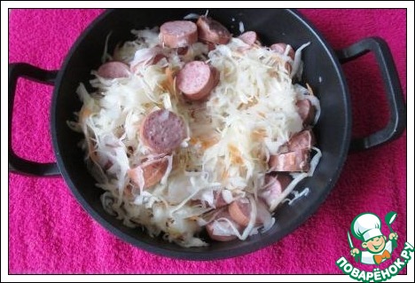 Выкладываем капусту в глубокий сотейник, добавляем нарезанную колбасу.