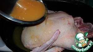 Полить утку, переворачивая ее, чтобы везде попал апельсиновый сок, оставить на 3 часа мариноваться в соке. -