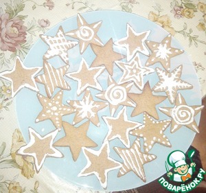 1 яичный белок+200 гр. сахарной пудры+ложка лимонного сока растереть, нанести рисунок, кайму на печенья.