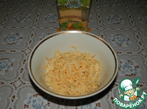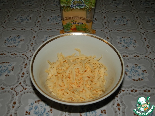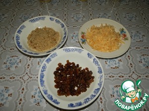 Приготовим начинку: оставшийся сыр натереть на крупной тёрке, орехи - на мелкой тёрке.