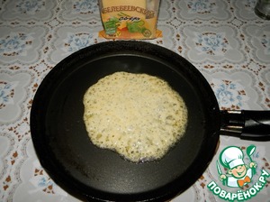 Теперь снимаем сковороду с огня и слегка остужаем, но не полностью... сырный блин должен быть тёплым.