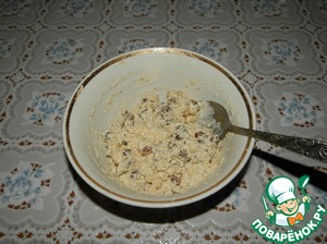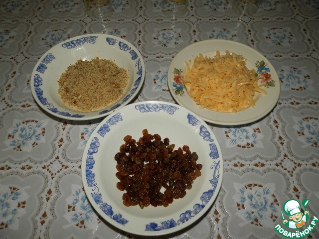 В глубокой посуде соединить тёртый сыр, изюм, грецкие орехи, выдавленный чеснок.