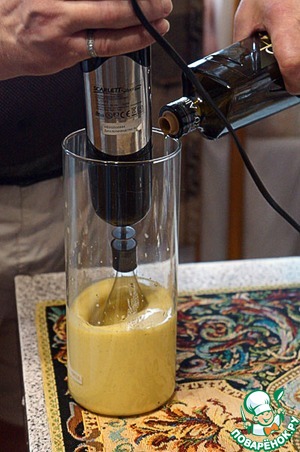 Перемешивать погружным блендером, постепенно, тонкой струйкой вливая оливковое масло.
