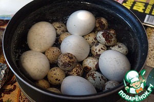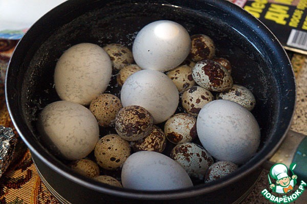 Перепелиные яйца сварить (пусть вас не смущает соседство с куриными на снимке: эти варятся для другого блюда), остудить в холодной воде, очистить.